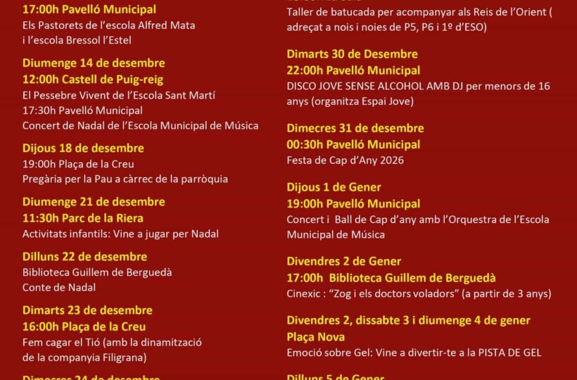 Aquest Nadal, omple’t d’emocions, música i tradicions! Descobreix totes les activitats programades per gaudir en família i viure l’esperit nadalenc a cada racó de Puig-reig. Dijous 4 de desembre 18:00h – Plaça de la Creu Encesa de llums de Nadal Cantada de Nadales, lectura de poemes i berenar de coc …