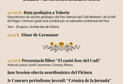 Organitza: Col·lectiu Toloriu – Cadí Dissabte 1 de novembre de 2025 a Toloriu 10:00 h — Ruta geològica a Toloriu Descobrirem els secrets geològics del Parc Natural del Cadí-Moixeró i de la Vall del Se …