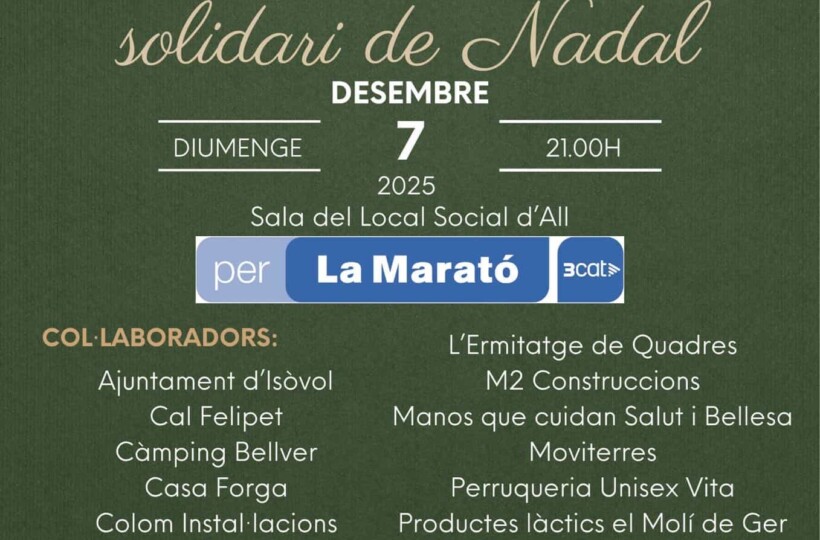 Es celebrarà un Quinto solidari de Nadal el diumenge 7 de desembre de 2025 a les 21.00 h a la Sala del Local Social d’All. L’esdeveniment és en benefici de La Marató de TV3, i el 50% de la recaptació anirà destinat a La Marató 2025. Desembre 7, 2025 – 21.00 h Sala del Local Social d’All Col·laborado …