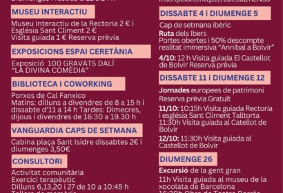 Octubre ’25 – Activitats Bolvir Museu Espai Ceretània De dilluns a divendres – Reserva prèvia Dissabtes: d’11 a 14 h i de 16 a 18 h Diumenges i festius: d’11 a 14 h Museu Interactiu Museu interactiu d …