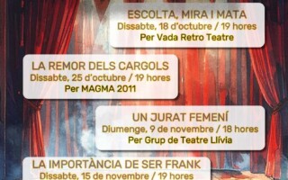 🎭 Taquilla inversa 📍 Sala del Teatre al Poliesportiu de Llívia Programa Dissabte, 18 d’octubre – 19 h Escolta, mira i mata Per Vada Retro Teatre Dissabte, 25 d’octubre – 19 h La re …