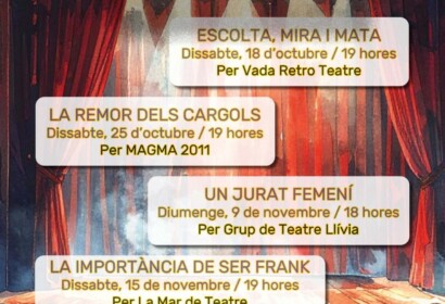 🎭 Taquilla inversa 📍 Sala del Teatre al Poliesportiu de Llívia Programa Dissabte, 18 d’octubre – 19 h Escolta, mira i mata Per Vada Retro Teatre Dissabte, 25 d’octubre – 19 h La remor dels cargols Per …