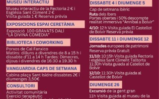 AVIÀ EXPOSICIÓ Divendres 17 d’octubre 18 h • Sala d’exposicions de l’Ajuntament d’Avià • Cuidar-nos és cosa de tothom. Gratuït. ball 18.30 h • Ateneu d’Avià • Preu: 6 €. Diumenge 19 d’octubre Amb Andr …