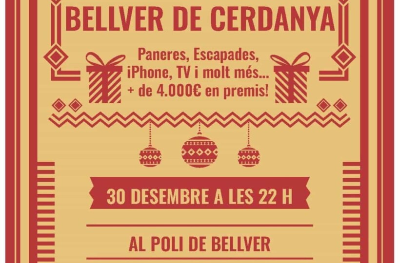 🎁 Paneres, escapades, iPhone, TV i molt més… 💰 + de 4.000 € en premis! 📅 30 de desembre a les 22 h 📍 Al Poli de Bellver 🕖 A partir de les 19 h venda de cartrons 👉 Màxim 5 cartrons …