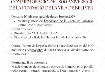 Dissabte 20 i diumenge 21 de desembre de 2025 • 12 h: Inauguració de l’exposició de la Carta de Població al Centre Cívic “Escoles velles”. Horari de l’exposició Dissabte, dia 20: de les 17 h a les 21 …
