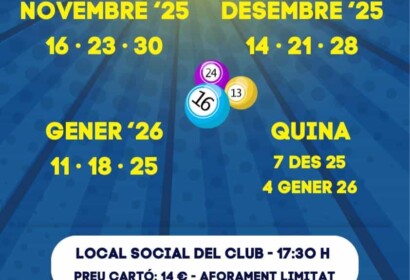 Torna el joc més esperat al local social del club! Vine a gaudir dels quintos i les quines durant els mesos d’hivern. Dates: Novembre 2025: 16 · 23 · 30 Desembre 2025: 14 · 21 · 28 Gener 2026: 11 · 18 …