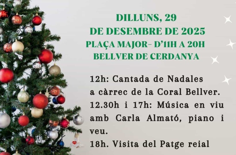 Dilluns, 29 de desembre de 2025 Plaça Major – d’11 h a 20 h Bellver de Cerdanya 12 h: Cantada de Nadales a càrrec de la Coral Bellver 12.30 h i 17 h: Música en viu amb Carla Almató …