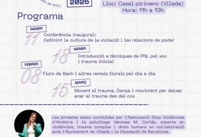 Tallers de prevenció, sensibilització i reparació de les violències masclistes Lloc: Casal Pirinenc (Vilada) Hora: d’11 h a 13 h Entrada lliure amb inscripció prèvia a: stopviolenc …