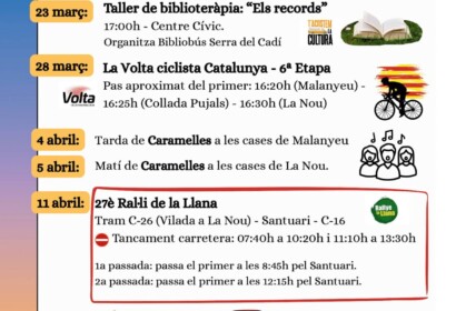 Agenda d’activitats març/abril 2026 14 de març Xerrada “Alimentació i cuina de primavera” 18.00 h – Aula Natura A càrrec d’Ester Comellas 23 de març Taller de biblioteràpia: “Els records” 17.00 h – Ce …
