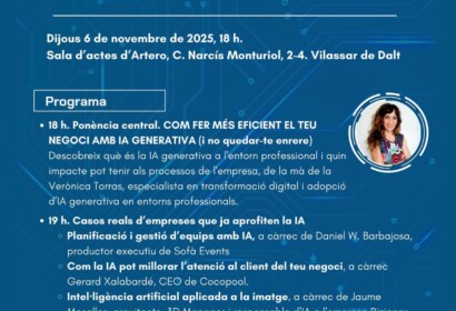 Dijous 6 de novembre de 2025, 18 h. Sala d’actes d’Artero, C. Narcís Monturiol, 2-4. Vilassar de Dalt Programa 18 h. Ponència central. COM FER MÉS EFICIENT EL TEU NEGOCI AMB IA GENERATIVA (i no quedar …