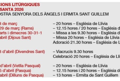 Misses a Nostra Senyora dels Àngels i Ermita de Sant Guillem Dissabte, 28 de març 20 h — Missa Església de Llívia Diumenge, 29 de març (Rams) 12.15 h — Missa 20 h — Missa Església de Llívia Dilluns, d …