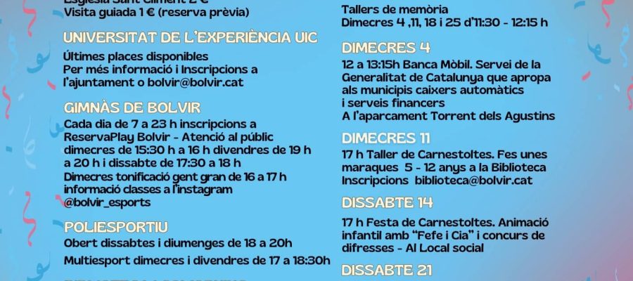 Aquest mes de febrer, Bolvir t’ofereix una àmplia varietat d’activitats culturals, esportives i socials per a totes les edats. Des de visites a museus i tallers de memòria fins a sessions de zumba, tornejos esportius i celebracions de Carnestoltes, el programa està pensat per fomentar la participació ciutadana i dinamitzar la vida al poble. A continuació, pots consultar tots els horaris i detalls perquè no et perdis cap proposta.
