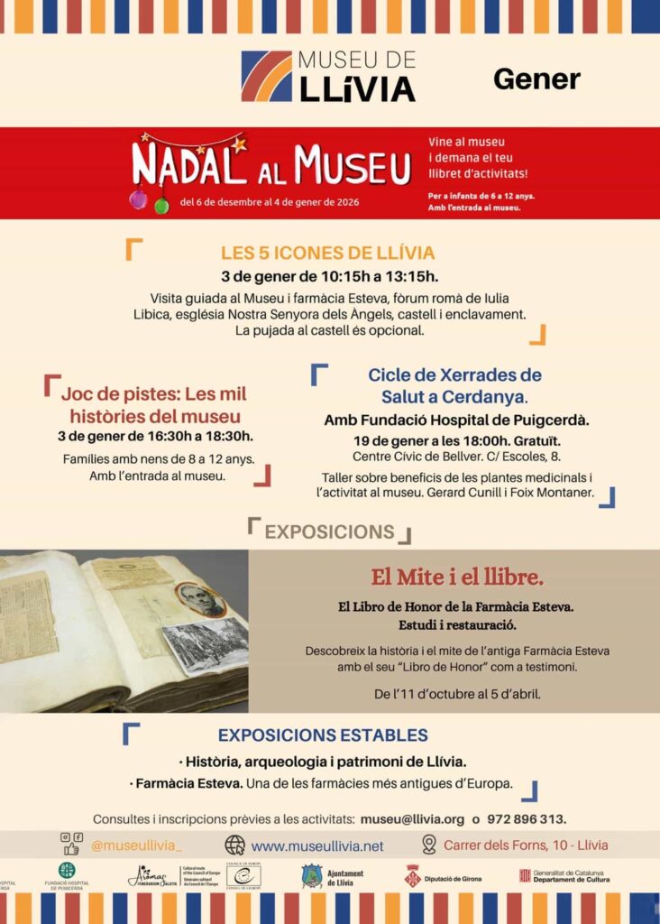 El Museu de Llívia ofereix durant aquest mes de gener una àmplia proposta d’activitats culturals per a tots els públics, especialment per a famílies amb infants. Visites guiades, jocs, tallers i exposicions formen part de la programació de Nadal al Museu, que s’allarga fins al 4 de gener de 2026.