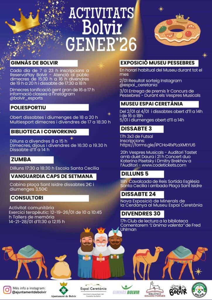 El municipi de Bolvir ha preparat una agenda completa d’activitats per aquest mes de gener. Tant per a grans com per a petits, hi trobareu propostes esportives, culturals i comunitàries que es duran a terme en diferents espais del poble. A continuació, us detallem tota la programació: