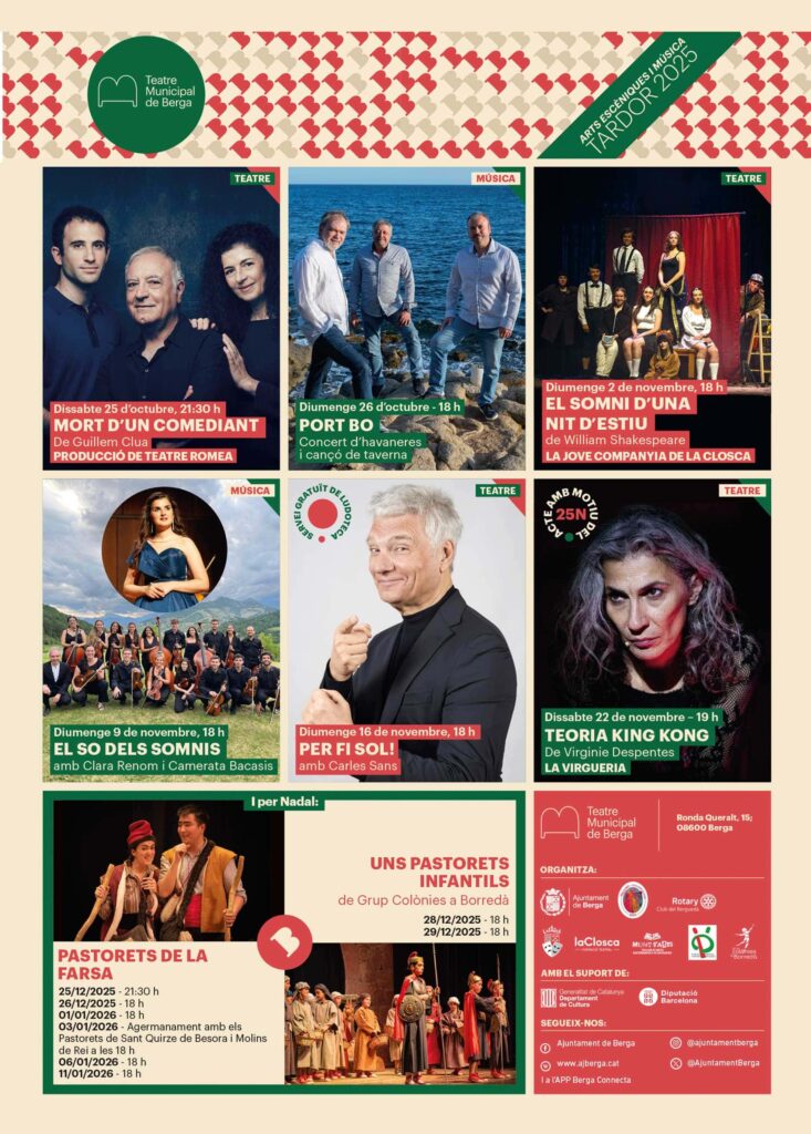Del 20 de setembre a l’11 de gener, el Teatre Municipal de Berga ha aixecat el teló ambuna programació variada de 11 espectacles de teatre i música. La temporada combina noms reconeguts de l’escena catalana, propostes locals i iniciatives socials, ambl’impuls de l’Ajuntament de Berga i el suport de la Generalitat, la Diputació i entitatsculturals del territori.