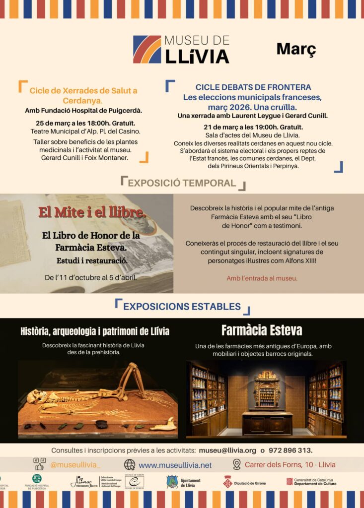 Aquest mes de març, el Museu de Llívia ofereix un ampli ventall d’activitats culturals, debats i exposicions per aprofundir en la història, el patrimoni i l’actualitat del territori.