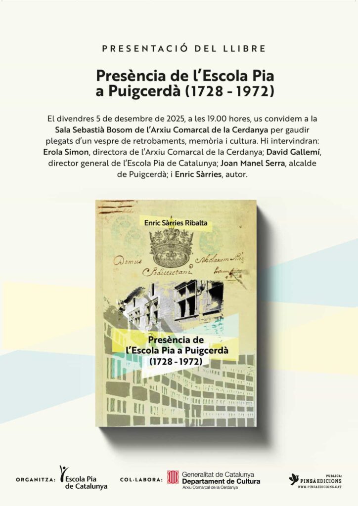 Un vespre de retrobaments, memòria i cultura per conèixer la història i l’impacte de l’Escola Pia a Puigcerdà. Durant l’acte hi intervindran: