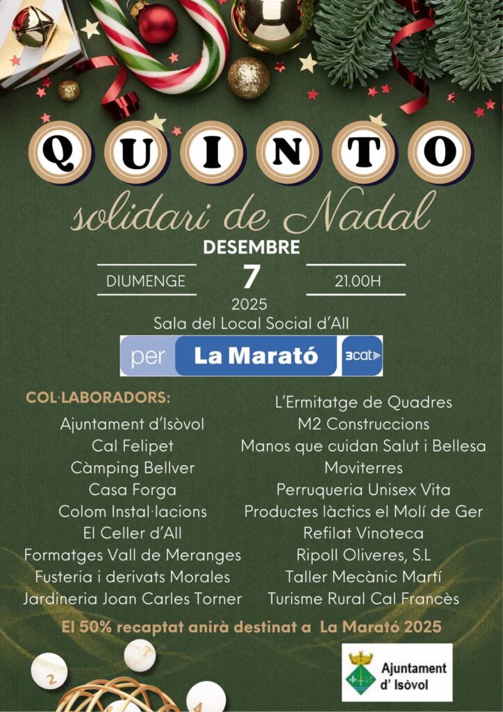 Es celebrarà un Quinto solidari de Nadal el diumenge 7 de desembre de 2025 a les 21.00 h a la Sala del Local Social d’All.
