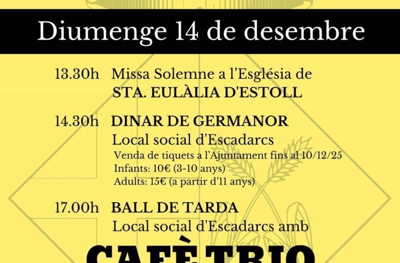 Diumenge, 14 de desembre 13.30 h – Missa Solemne a l’Església de Santa Eulàlia d’Estoll 14.30 h – Dinar de germanor al Local Social d’Escadarcs Venda de tiquets a l’Ajuntament fins al 10/12/25 Preus: Infants (3-10 anys): 10 € Adults (a partir d’11 anys): 15 € 17.00 h – Ball de tarda amb Cafè Trio al …