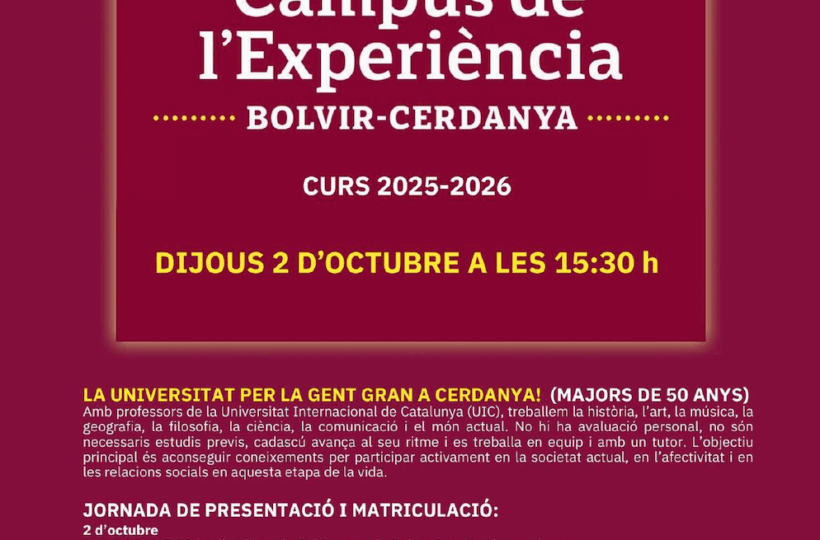 El dijous 2 d’octubre a les 15:30 h tindrà lloc la jornada de presentació del Campus de l’Experiència Bolvir-Cerdanya per al curs 2025-2026, a l’auditori de Cal Fanxico de Bolvir. Aquesta iniciativa, adreçada a persones majors de 50 anys, compta amb professors de la Universitat Internacional de Cata …