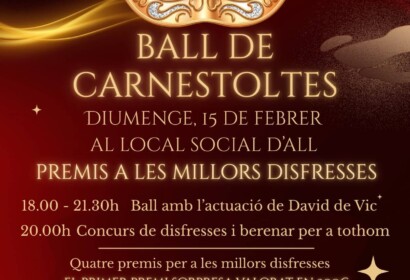 Diumenge, 15 de febrer Local Social d’All – Isòvol Els Amics del Ball i l’Ajuntament d’Isòvol et conviden a gaudir d’una vetllada festiva amb música en directe, disfresses i molta diversió. 18.00 – 21 …