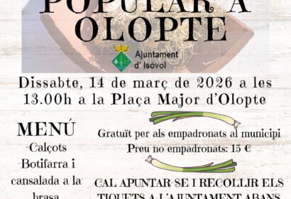 L’Ajuntament d’Isòvol organitza una nova edició de la Calçotada Popular a Olopte. Una jornada per gaudir de la bona companyia i la gastronomia tradicional en un ambient festiu i obert a tothom. 📍 Plaç …