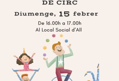 Diumenge, 15 de febrer De 16.00 h a 17.00 h Local Social d’All – Isòvol L’Ajuntament d’Isòvol organitza un taller de circ dins les activitats de Carnestoltes 2026, pensat per a petits i grans. Taller …