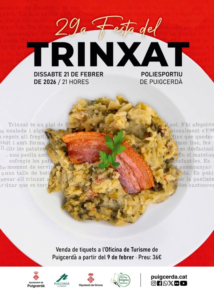 L’Ajuntament de Puigcerdà, amb la col·laboració de l’Associació de Cuina Pirinenca de Cerdanya i dels restaurants locals, ja treballa en l’organització de la 29a edició de la Festa del Trinxat, que tindrà lloc el pròxim 21 de febrer al pavelló del Poliesportiu. La cita s’ha consolidat al llarg dels anys com una trobada imprescindible del calendari hivernal al Pirineu, estretament vinculada a la tradició gastronòmica de la comarca.