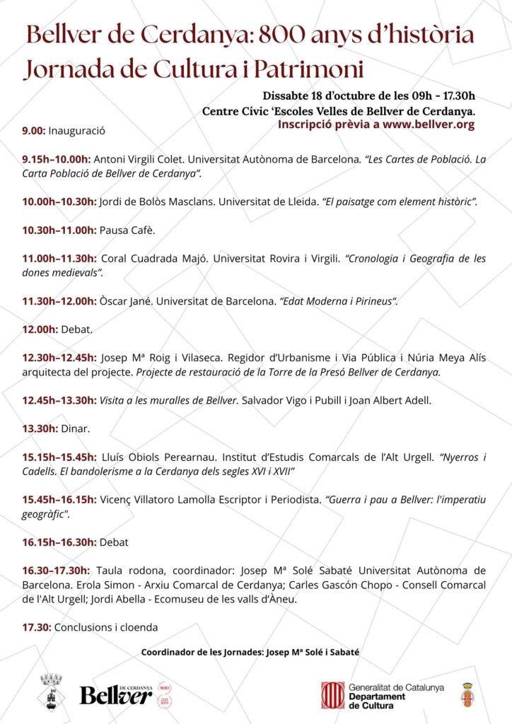El programa s’obrirà a les 9 h amb la inauguració oficial i donarà pas a un conjunt de ponències que aborden diferents èpoques i perspectives. Entre les intervencions destaquen la d’Antoni Virgili (UAB) sobre les cartes de població i la fundació de Bellver; Jordi Bolòs (UdL), que parlarà del paisatge com a element històric; Coral Cuadrada (URV), que analitzarà la cronologia i geografia de les dones medievals; i Òscar Jané (UB), que situarà Bellver en el marc de l’edat moderna i els Pirineus.