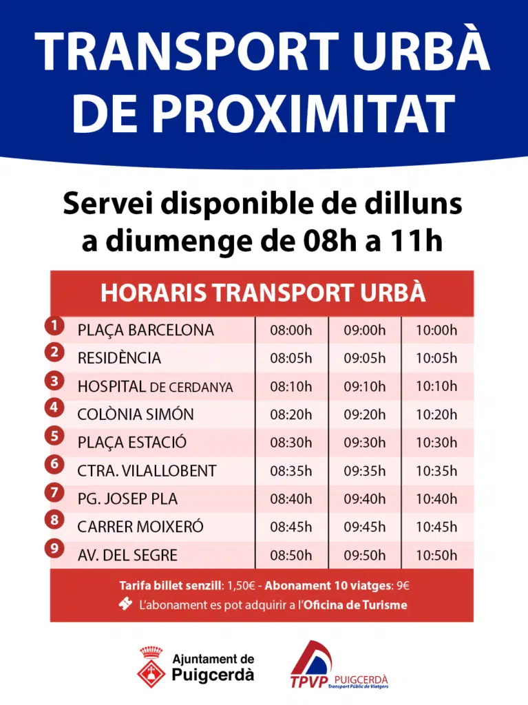 Puigcerdà torna a disposar del servei de transport urbà de proximitat, conegut com a taxi-bus, una iniciativa municipal pensada per facilitar la mobilitat diària i garantir una millor connexió entre els diferents barris i els serveis essencials de la vila. El servei s’adreça especialment a les persones que necessiten desplaçar-se en hores punta i busca oferir una alternativa còmoda i accessible al vehicle privat.