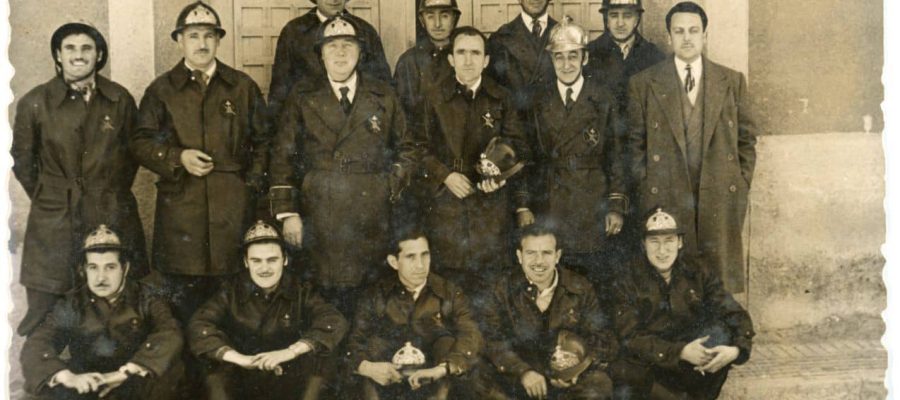 Bombers de Puigcerdà celebrant la festa del seu patró davant de l’antic parc de Bombers, a la cruïlla dels carrers Alfons I i Coronel Molera (1953).