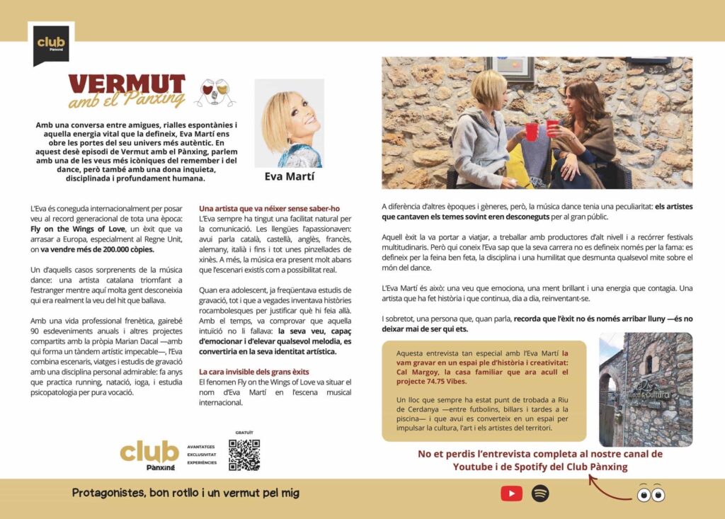 Amb una conversa entre amigues, rialles espontànies i aquella energia vital que la defineix, Eva Martí ens obre les portes del seu univers més autèntic. En aquest desè episodi de Vermut amb el Pànxing, parlem amb una de les veus més icòniques del remember i del dance, però també amb una dona inquieta, disciplinada i profundament humana.